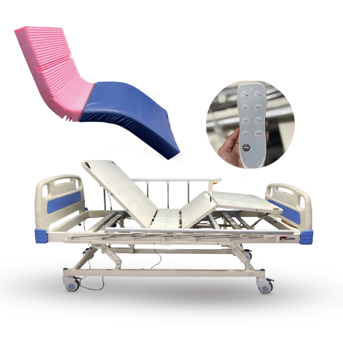 -Posiciones: Horizontal, semifowler, fowler, sentado, flexión rodillas, auto-contorno, cambio de altura, trendelemburg, trendelemburg inverso, hipertenso, silla cardiaca y posición automática de reanimación cardiopulmonar CPR; los movimientos se accionan por medio de control de mando eléctrico.